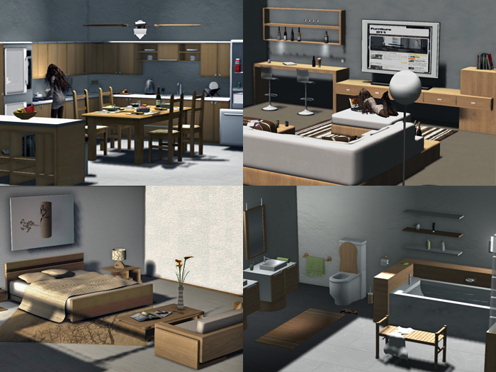 This set has furniture for whole house: living room, bedroom, bathroom, kitchen and dining room. All rooms have high quality sit and lay animations, sex and cuddle animations.Total 800 animations. Bathroom, bedroom and kitchen are 100% mesh. All furniture are copy-mod, so make all the changes you like and take copies, plus always have the original copy to rezz.