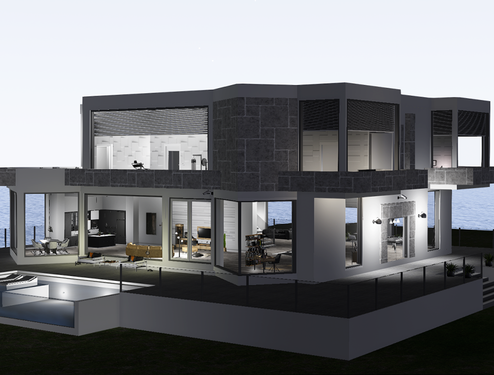 Inside, the Everest Modern Villa offers a bright, open-concept living area with large panoramic windows and a seamless layout that connects the interior with the outdoor pool and lounge area.